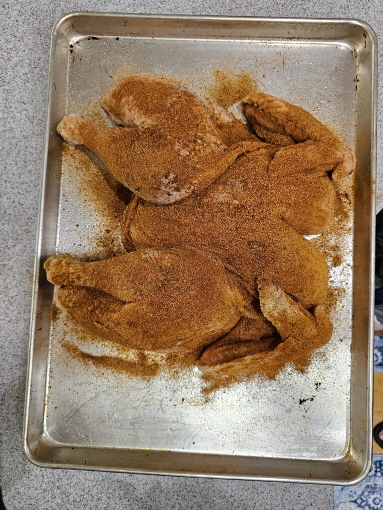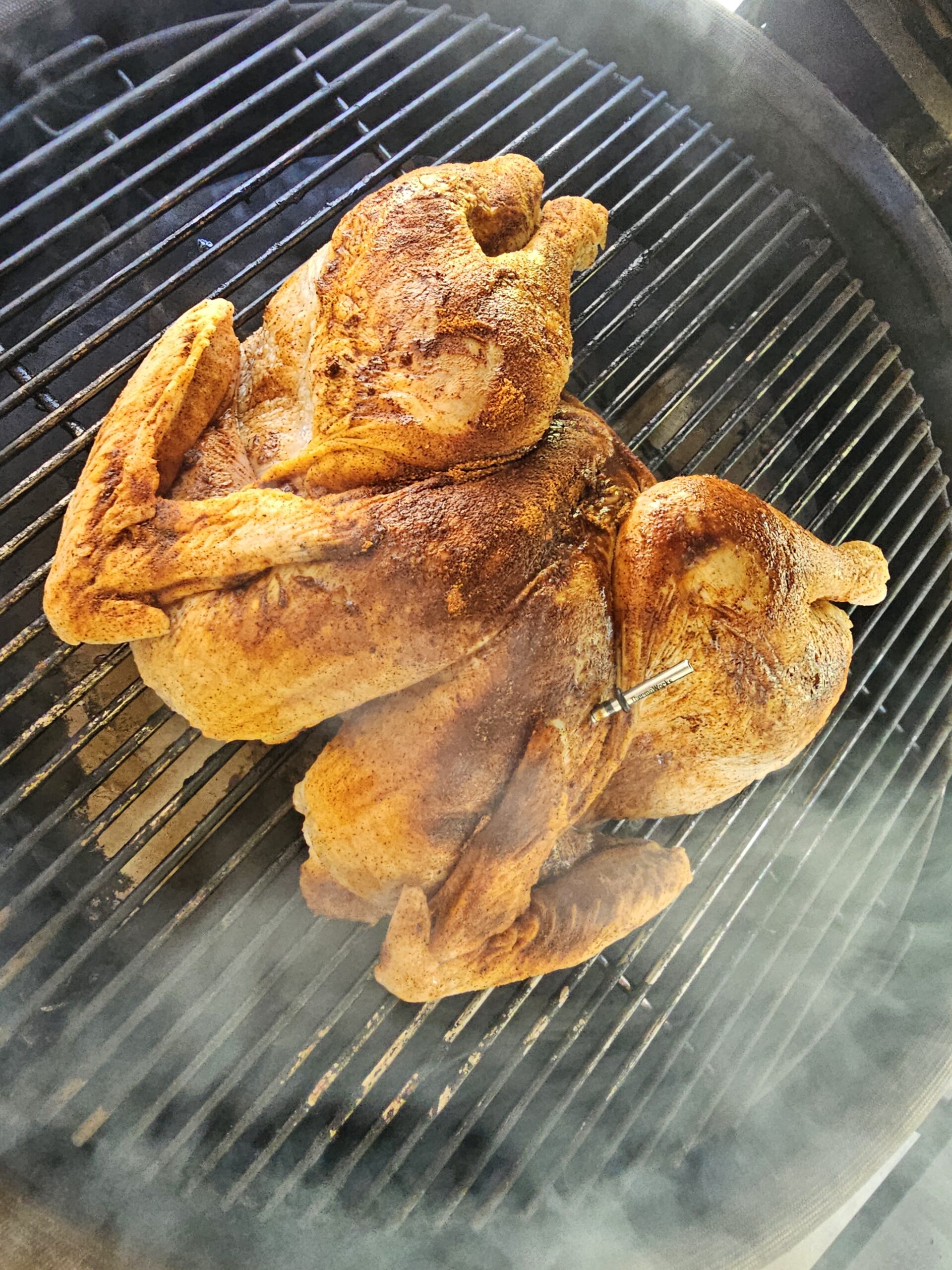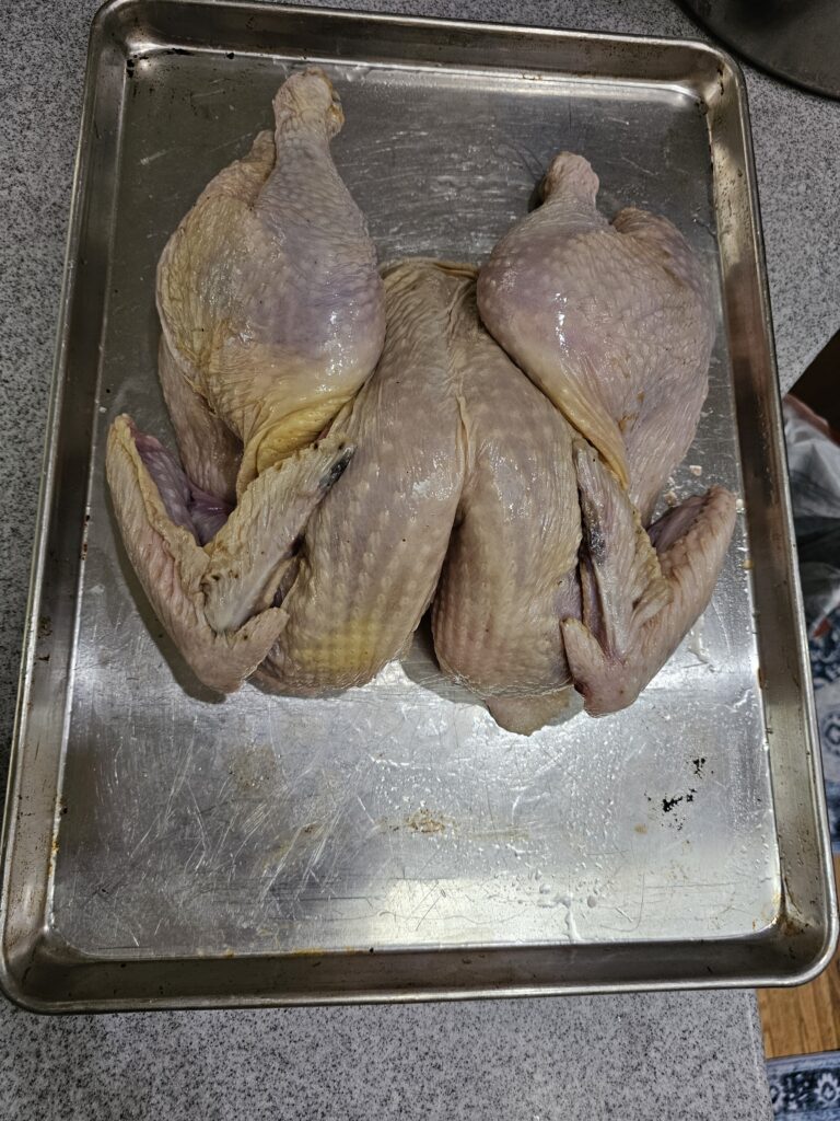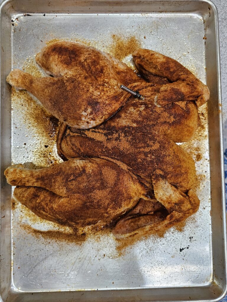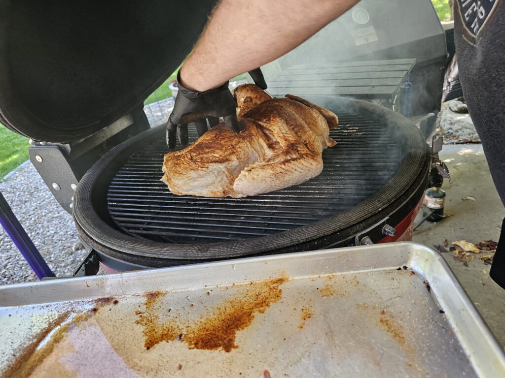 - Spatchcocked the turkey (removed the backbone and flattened it) for more even cooking on our Kamado Joe ceramic smoker