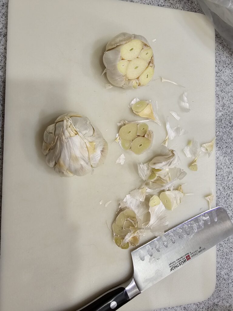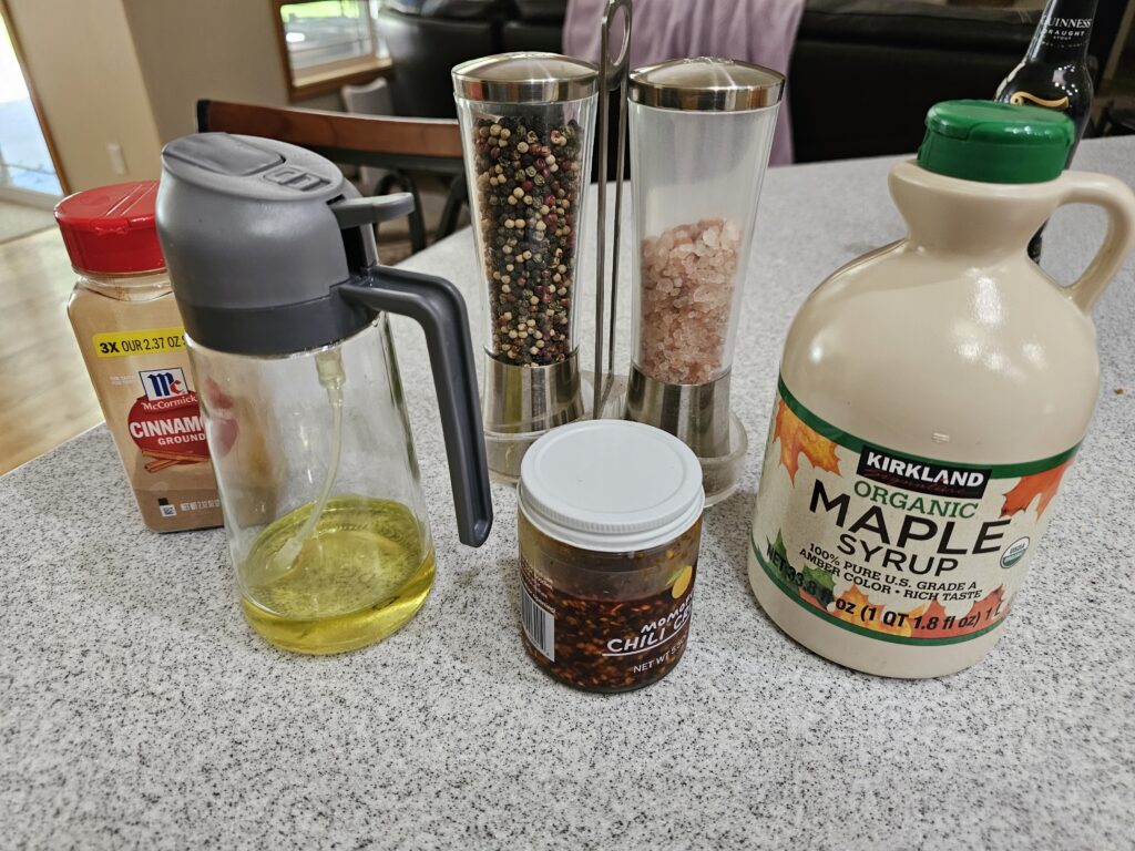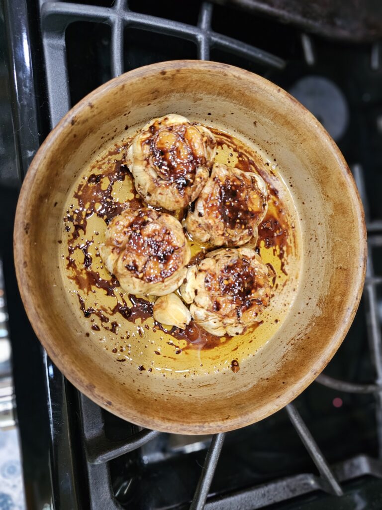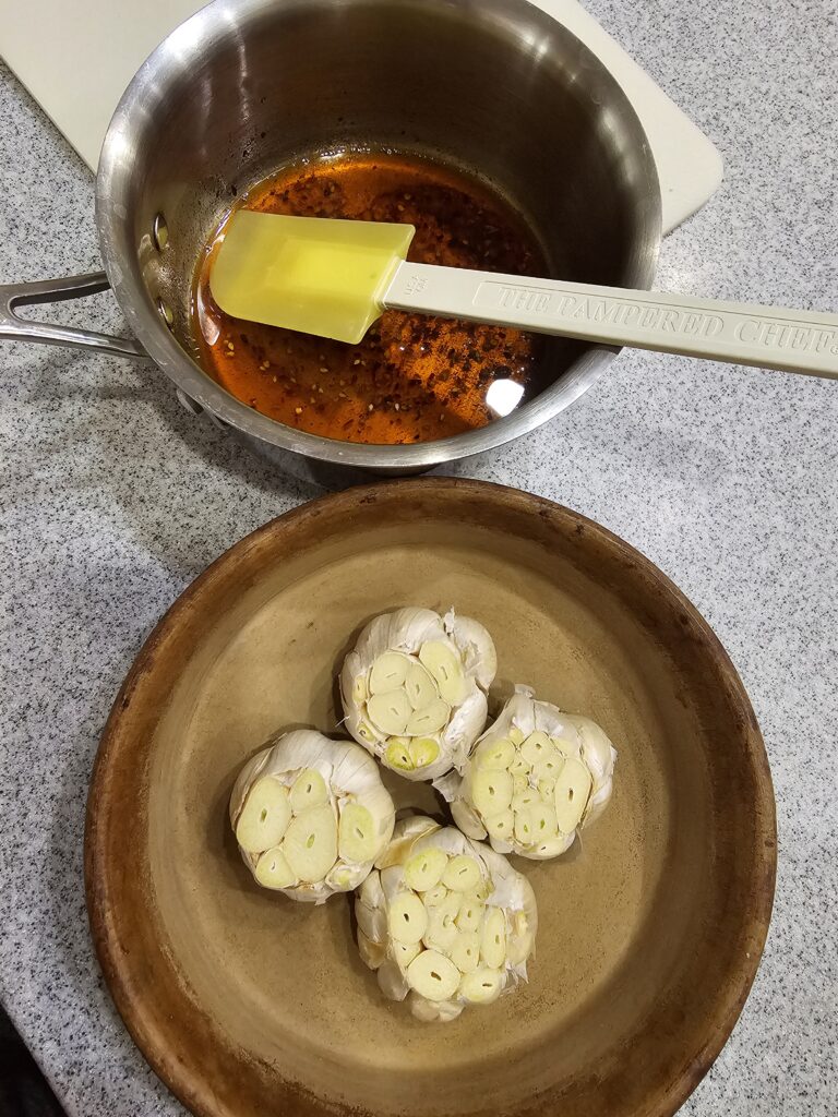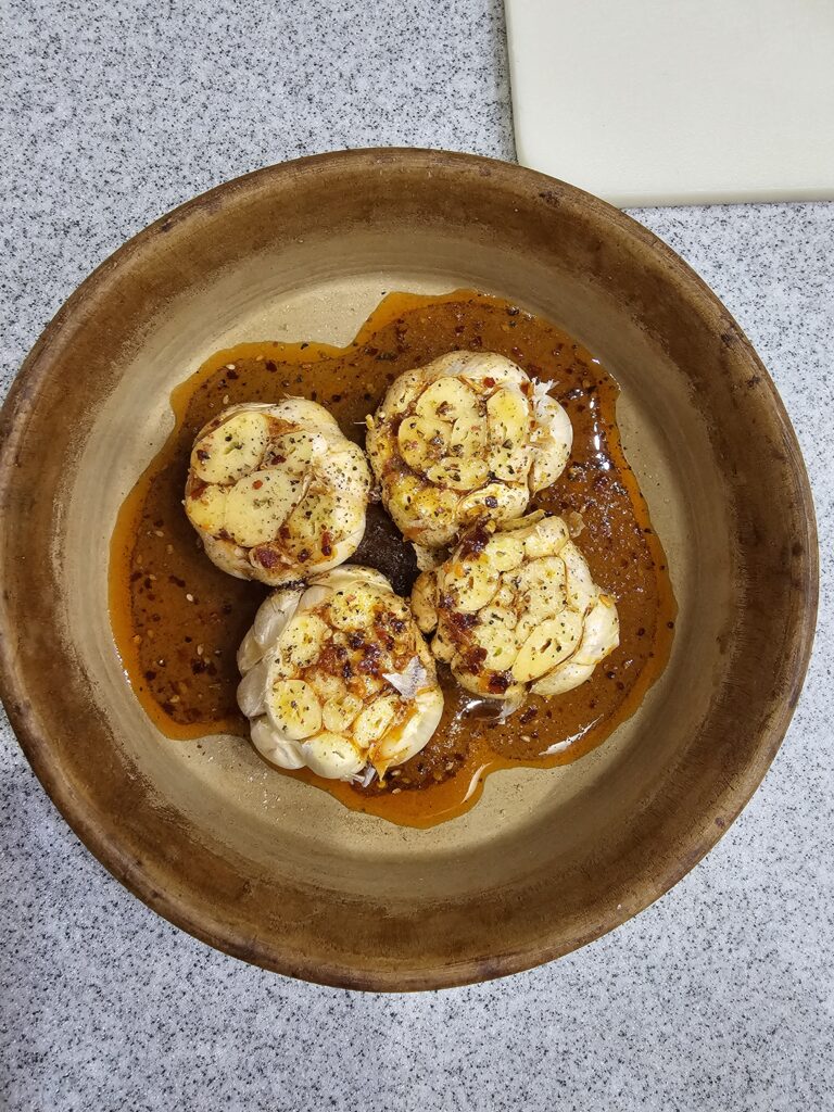 - Maple-glazed roasted garlic (four whole heads roasted in olive oil, maple syrup, chili flakes, salt, and pepper, basted every 15 minutes)