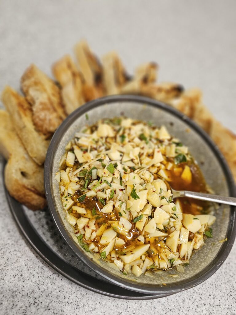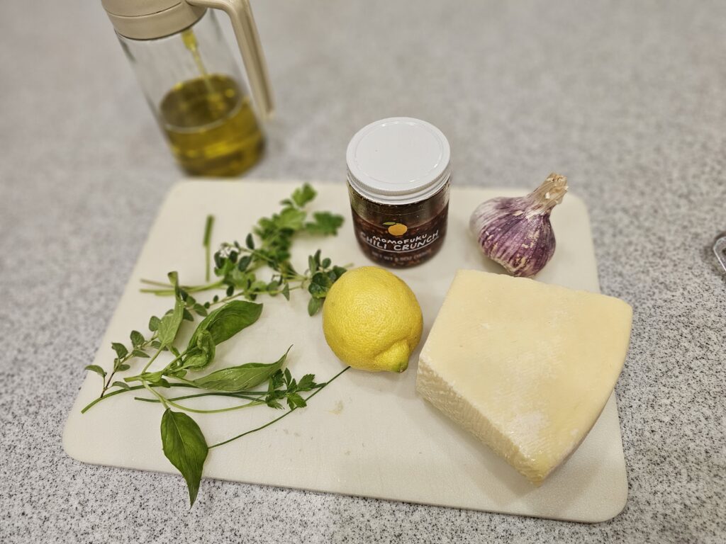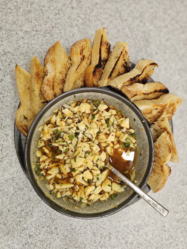 - Saturday night: Small portions of everything (we were full from “tasting” all day and snacking on sourdough toast with a Parmesan-herb-chili oil mixture)