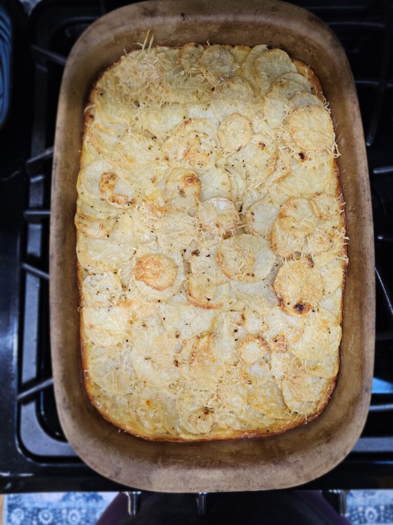 - Topped with thinly sliced scalloped potatoes